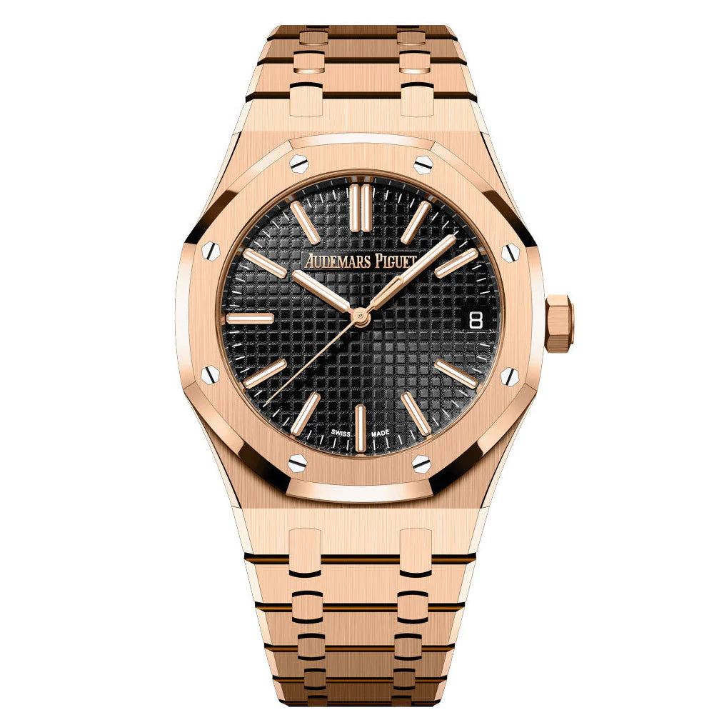 18kt rose gold case and bracelet. Fixed 18kt rose gold bezel. Black dial with rose gold-tone hands and index hour markers. Minute markers around the outer rim. Dial Type: Analog. Luminescent hands and markers. Date display at the 3 o'clock position. Audemars Piguet Calibre 4302 Automatic movement, containing 32 Jewels, bitting at 28800 vph, and has a power reserve of approximately 70 hours. Scratch resistant sapphire crystal. Screw down crown. Transparent see through case back. Octagon case shape, case size: 41 mm, case thickness: 10.5 mm. Fold over clasp with a safety release. Water resistant at 50 meters / 165 feet. Functions: date, hour, minute, second.
