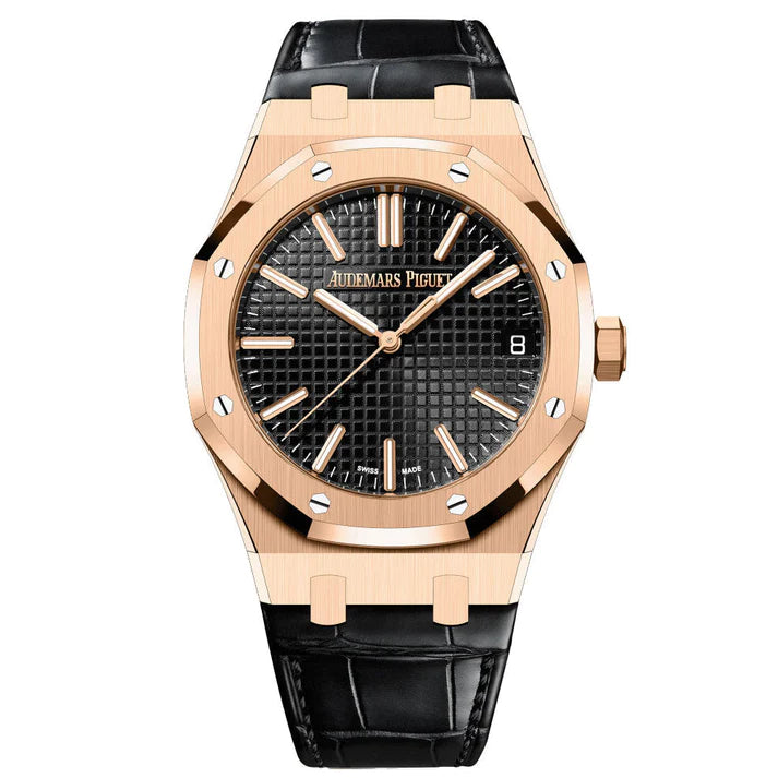 Rose gold-tone 18kt rose gold case with a Black alligator band. Fixed rose gold-tone 18kt rose gold bezel. Black dial with rose gold-tone hands and index hour markers. Minute markers around the outer rim. Dial Type: Analog. Luminescent hands and markers. Date display at the 3 o'clock position. Audemars Piguet Calibre 4302 Automatic movement, containing 32 Jewels, bitting at 28800 vph, and has a power reserve of approximately 70 hours. Scratch resistant sapphire crystal. Screw down crown. Transparent see through case back. Octagon case shape, case size: 41 mm, case thickness: 10.5 mm. Fold over clasp with a safety release. Water resistant at 50 meters / 165 feet. Functions: date, hour, minute, second.