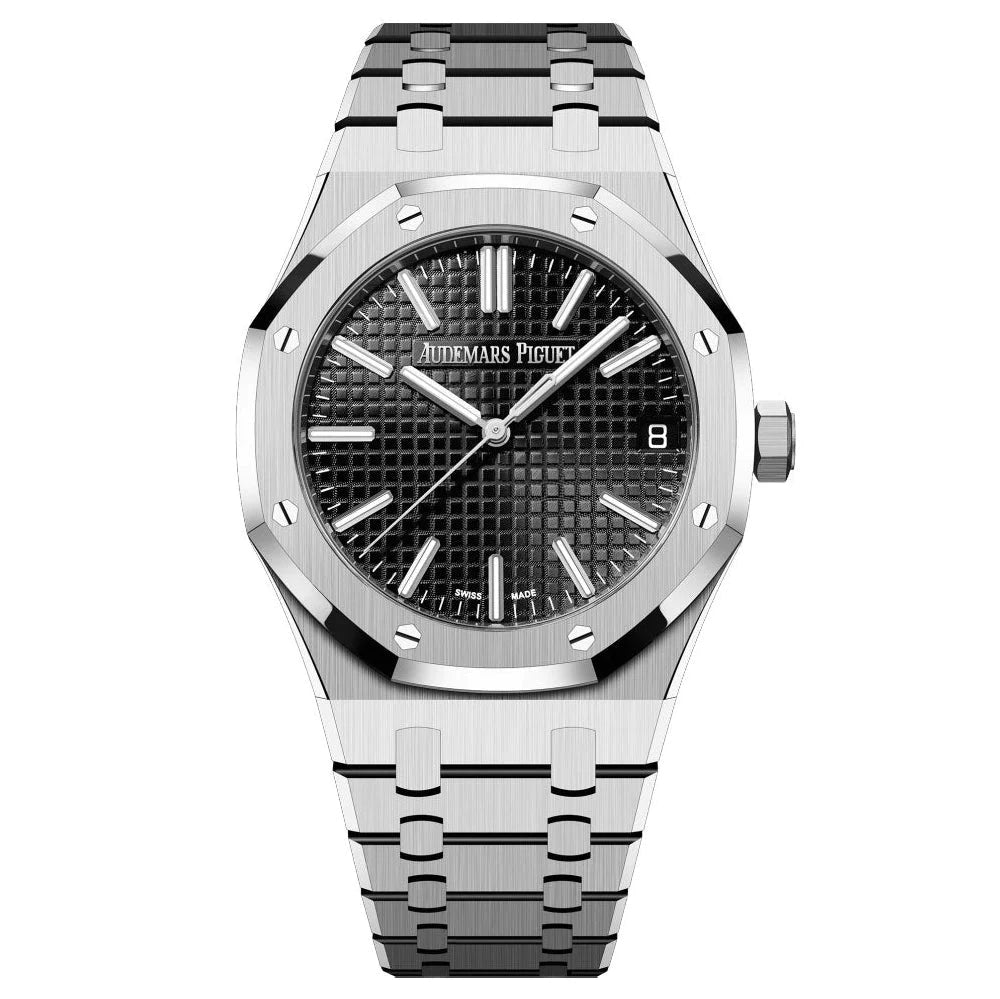 Silver-tone stainless steel case and bracelet. Fixed silver-tone stainless steel bezel. Black dial with silver-tone hands and index hour markers. Minute markers around the outer rim. Dial Type: Analog. Luminescent hands and markers. Date display at the 3 o'clock position. Audemars Piguet Calibre 4302 Automatic movement, containing 32 Jewels, bitting at 28800 vph, and has a power reserve of approximately 70 hours. Scratch resistant sapphire crystal. Screw down crown. Transparent see through case back. Round case shape, case size: 41 mm, case thickness: 10.5. Fold over clasp with a safety release. Water resistant at 50 meters / 165 feet. Functions: date, hour, minute, second.