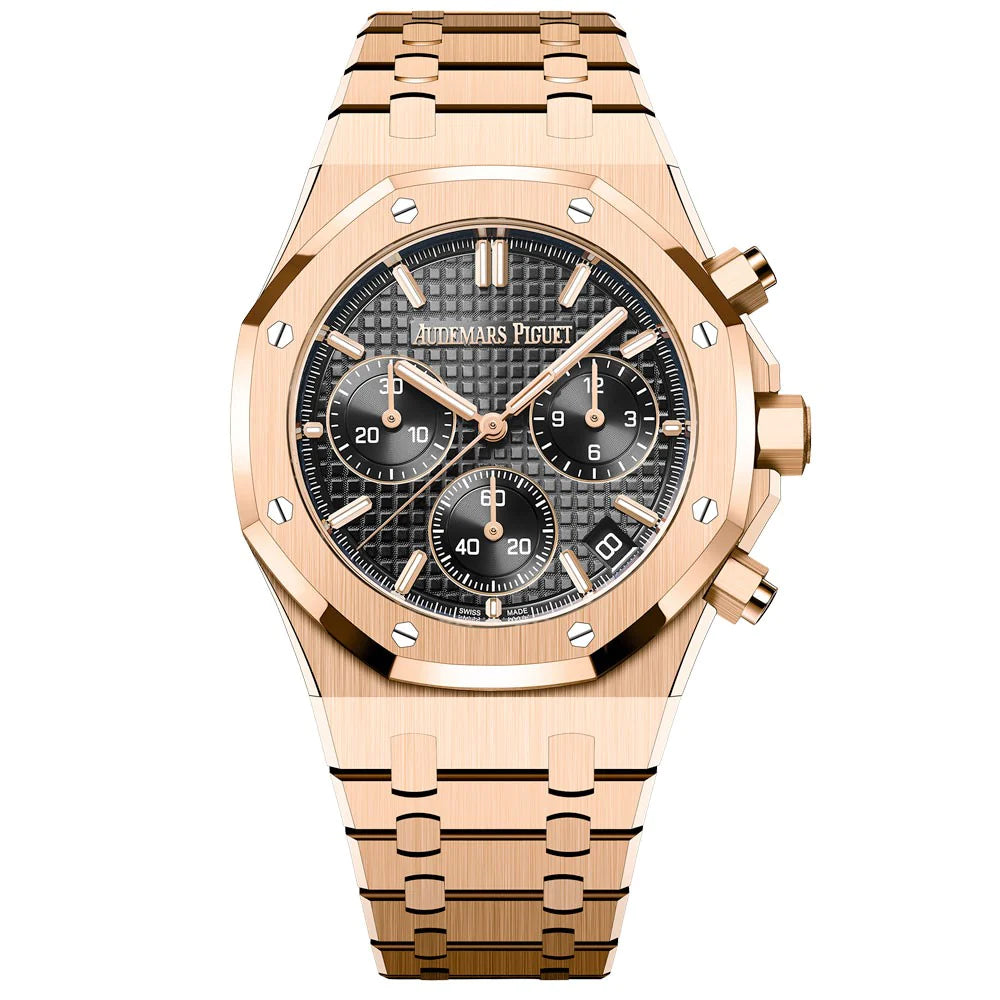18kt Rose gold case and bracelet. Fixed rose gold-tone 18kt rose gold bezel. Black dial with rose gold-tone hands and index hour markers. Minute markers around the outer rim. Dial Type: Analog. Luminescent hands and markers. Date display between 4 and 5 o'clock position. Chronograph - three sub-dials displaying: 60 second, 30 minute and 12 hour. Audemars Piguet Calibre 2385 Automatic movement, containing 37 Jewels, composed of 304 parts, bitting at 21600 vph, and has a power reserve of approximately 40 hours. Scratch resistant sapphire crystal. Screw down crown. Transparent see through case back. Octagon case shape, case size: 41 mm. Deployment with push button release clasp. Water resistant at 50 meters / 165 feet. Functions: chronograph, column wheel, date, hour, minute, small second.