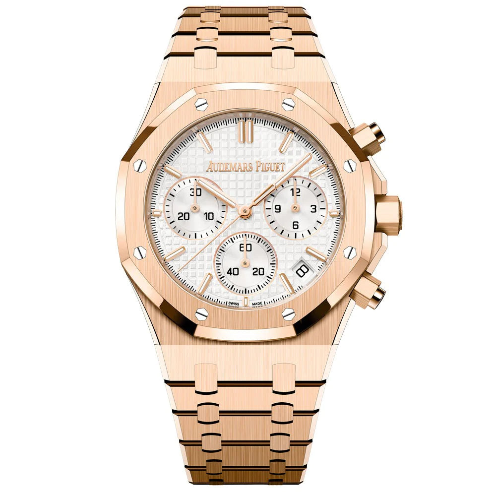 18kt rose gold case and bracelet. Fixed rose gold-tone 18kt rose gold bezel. White dial with rose gold-tone hands and index hour markers. Minute markers around the outer rim. Dial Type: Analog. Luminescent hands and markers. Date display between 4 and 5 o'clock position. Chronograph - three sub-dials displaying: 60 second, 30 minute and 12 hour. Audemars Piguet Calibre 2385 Automatic movement, containing 37 Jewels, composed of 304 parts, bitting at 21600 vph, and has a power reserve of approximately 40 hours. Scratch resistant sapphire crystal. Screw down crown. Transparent see through case back. Octagon case shape, case size: 41 mm. Deployment with push button release clasp. Water resistant at 50 meters / 165 feet. Functions: chronograph, column wheel, date, hour, minute, small second.