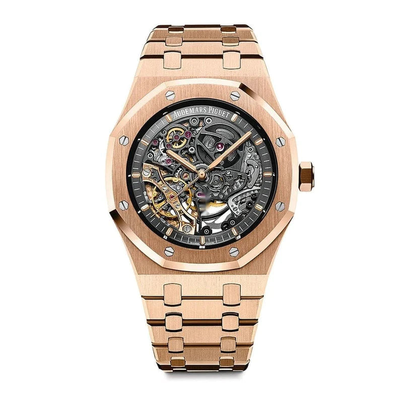 18kt rose gold case and bracelet. 8 screws fixed 18kt rose gold bezel. Skeleton dial with rose gold-tone hands and index hour markers. Dial Type: Analog. Luminescent hands and markers. Audemars Piguet Calibre 3132 Automatic movement, based upon Audemars Piguet AP 3120, containing 38 Jewels, bitting at 21600 vph, and has a power reserve of approximately 45 hours. Scratch resistant sapphire crystal. Screw down crown. Skeleton transparent exhibition see through case back. Octagon case shape, case size: 41 mm, case thickness: 9.9 mm. Fold over with safety release clasp. Water resistant at 50 meters / 165 feet. Functions: hours, minutes, centre seconds.