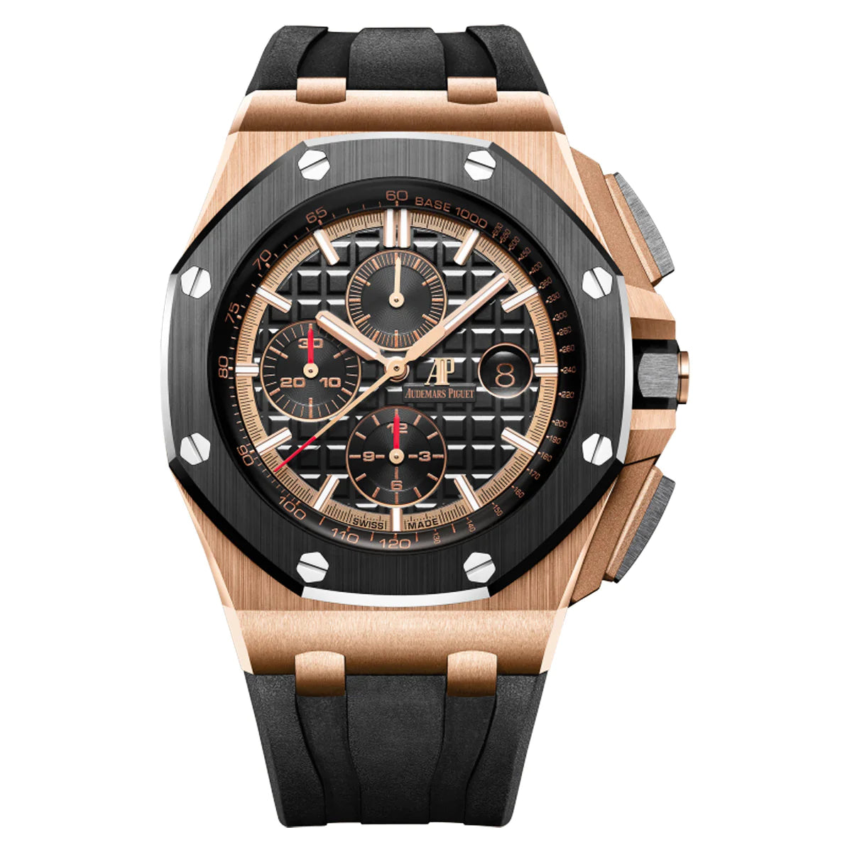 18kt rose gold case with a black rubber strap. 8 screws fixed black ceramic bezel. Black mega tapisserie dial with luminous rose gold-tone hands and index hour markers. Minute markers. tachymeter markings around the outer rim. Dial Type: Analog. Luminescent hands and markers. Date display at the 3 o'clock position. Chronograph - three sub-dials displaying: 60 second, 30 minute and 12 hour. Audemars Piguet Calibre 3126/3840 Automatic movement, based upon Audemars Piguet 3120, containing 59 Jewels, composed of 365 parts, bitting at 21600 vph, and has a power reserve of approximately 55 hours. Scratch resistant sapphire crystal. Screw down crown. Transparent case back. Octagon case shape, case size: 44 mm, case thickness: 14.4 mm. Tang clasp. Water resistant at 100 meters / 330 feet. Functions: chronograph, tachymeter, date, hour, minute, second.
