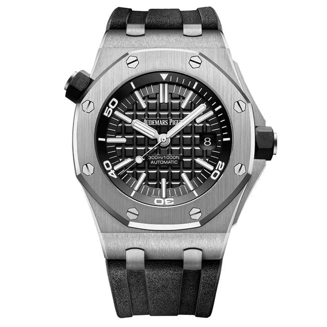 Stainless steel case with a black rubber strap. Fixed stainless steel bezel. Black (waffle pattern) dial with luminous silver-tone hands and index hour markers. Minute markers around the outer rim. Dial Type: Analog. Luminescent hands and markers. Date display at the 3 o'clock position. Audemars Piguet calibre 3120 Automatic movement, containing 40 Jewels, composed of 280 parts, bitting at 21600 vph, and has a power reserve of approximately 60 hours. Scratch resistant sapphire crystal. Screw down crown. Skeleton case back. Octagon case shape. Case size: 42 mm. Case thickness: 14 mm. Tang clasp. Water resistant at 300 meters / 1000 feet. Functions: date, hour, minute, second.