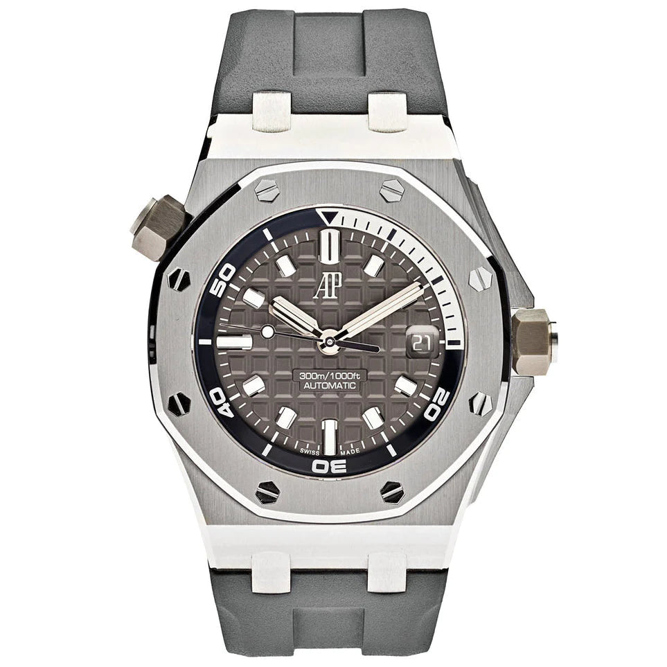 Stainless steel case with a grey rubber strap. Fixed silver-tone stainless steel bezel. Grey dial with silver-tone hands and index hour markers. Minute markers around the outer rim. Dial Type: Analog. Luminescent hands and markers. Date display at the 3 o'clock position. Audemars Piguet Calibre 4308 automatic movement with a 60-hour power reserve. Scratch resistant sapphire crystal. Screw down crown. Transparent see through case back. Octagon case shape, case size: 42 mm, case thickness: 14.2 mm. Buckle clasp. Water resistant at 30 meters / 1000 feet. Functions: date, hour, minute, second.