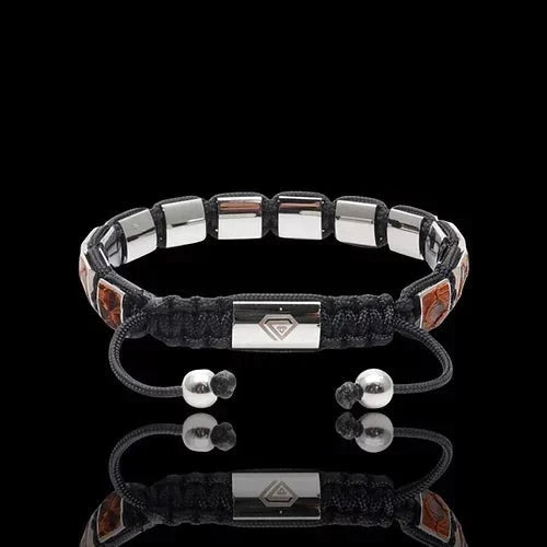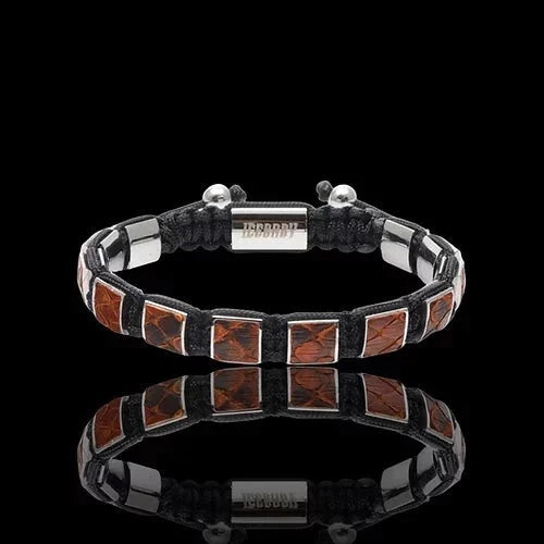 This eye-catching handmade woven bracelet is crafted from python skin. The bracelet is embellished with uniquely shaped square charms.