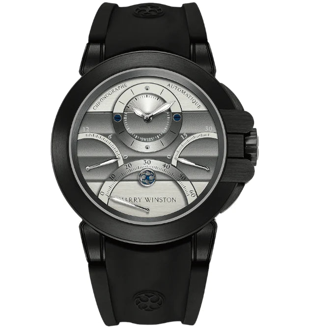 Black zalium case with a black rubber strap. Fixed black zalium bezel. Silver dial with luminous silver-tone hands and index hour markers. Dial Type: Analog. Luminescent hands. Chronograph - three displays showing: 60 second, 30 minute and 12 hour. Automatic movement. Scratch resistant sapphire crystal. Transparent case back. Round case shape. Case size: 44 mm. Case thickness: 12.50 mm. Deployment tang clasp. Water resistant at 100 meters / 330 feet. Functions: chronograph, hour, minute, small second.
