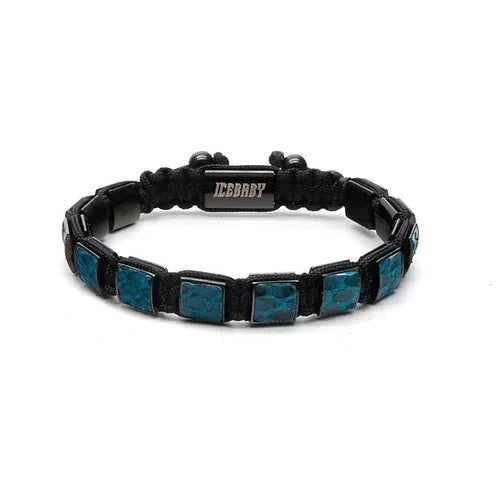 This eye-catching handmade woven bracelet is crafted from python skin. The bracelet is embellished with uniquely shaped square charms.