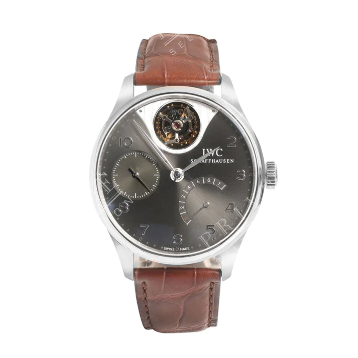 18kt white gold case with a brown leather strap. Fixed 18kt white gold bezel. Grey dial with silver-tone hands and index and Arabic numerals hour markers. Minute markers around the outer rim. Dial Type: Analog. Three sub-dials displaying: 60 second, power reserve indicator and tourbillon. IWC Calibre 50900 Automatic movement, based upon IWC 5011, containing 44 Jewels, bitting at 19800 vph, and has a power reserve of approximately 168 hours. Scratch resistant sapphire crystal. 18k white gold crown. Sapphire crystal display case back. Round case shape, case size: 44.2 mm, case thickness: 14.2 mm. Tang clasp. Water resistant at 30 meters / 100 feet. Functions: hours, minutes, subsidiary seconds (9 o'clock), 7-day power reserve (4 o'clock), skeletonized tourbillon (12 o'clock). Additional Info: limited edition of 250 watches; small seconds subdial; power reserve display; minute tourbillon; Breguet spring; 7 day power reserve when fully wound;. Portuguese Tourbillon Mystere Limited Edition Series.