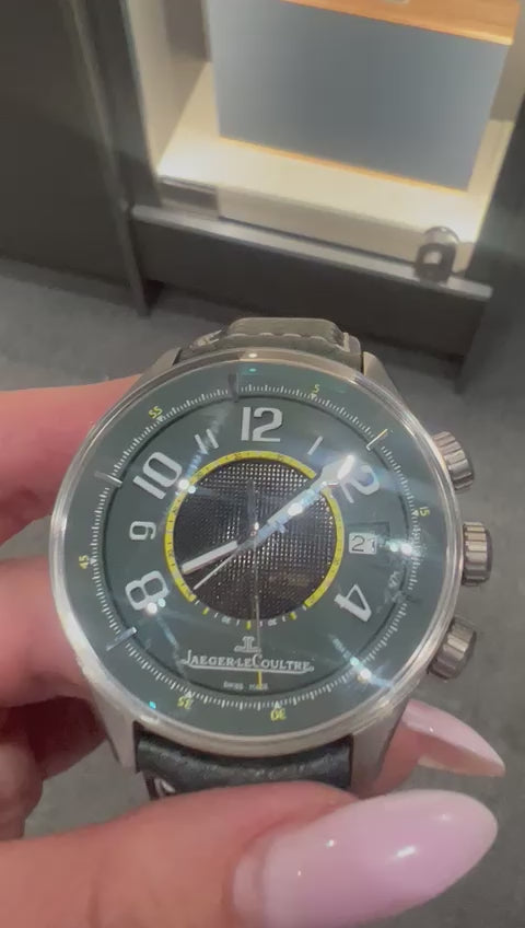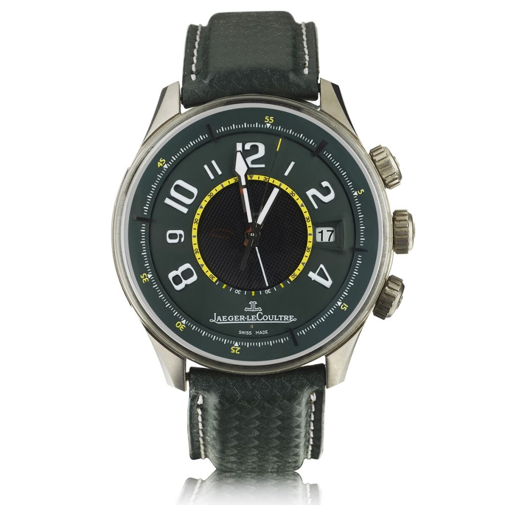 Gent's titanium Jaeger-LeCoultre Aston Martin R-Alarm Amvox 1 wristwatch. Green dial with black textured center and yellow accents. Functions: Time, quick-set date and alarm. Automatic movement; calibre 918. Original Green JLC band with contrasting white stitching; original titanium buckle. Sapphire crystal. Limited edition of 500 pieces. Circa 2000. 44mm case diameter. Reference #: 191.T.97.