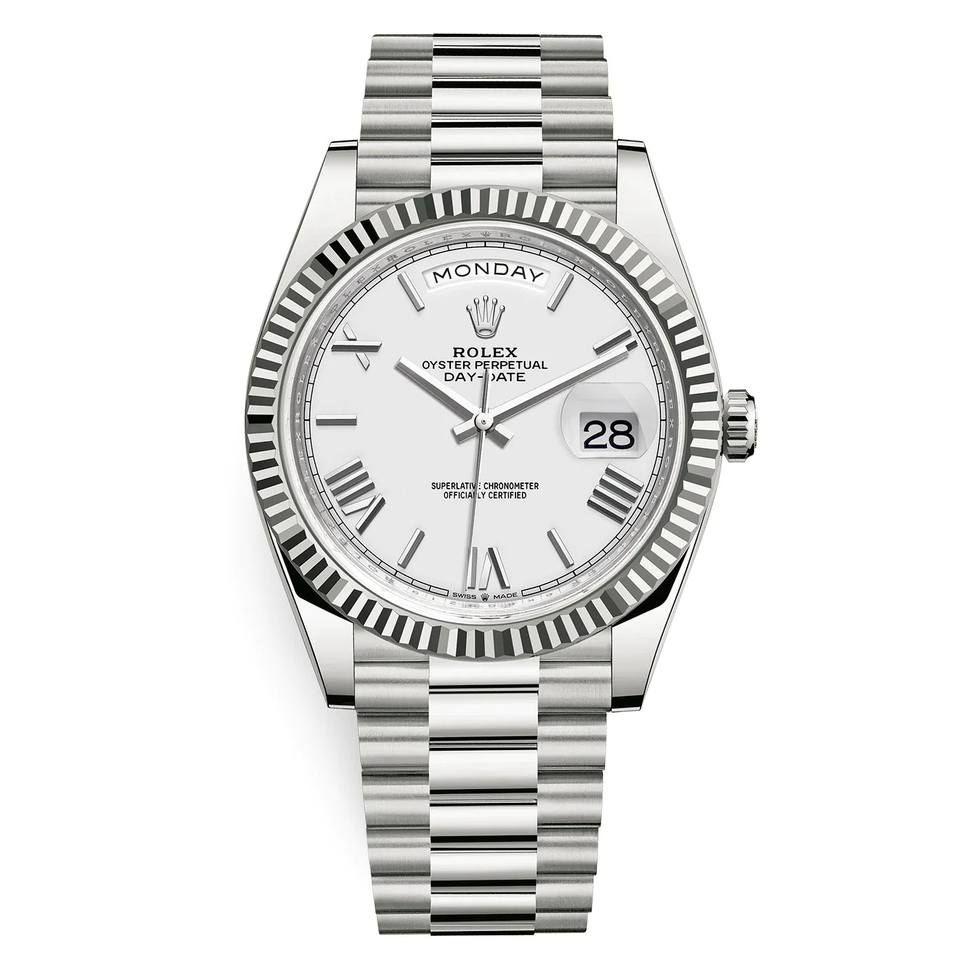 18kt white gold case with a 18kt white gold Rrolex president bracelet. Fixed fluted 18kt white gold bezel. White dial with silver-tone hands and index and Roman numeral hour markers. Minute markers around the outer rim. Dial Type: Analog. Date display at the 3 o'clock position. Day of the week display at the 12 o'clock position. Rolex calibre 3255 automatic movement with a 70-hour power reserve. Scratch resistant sapphire crystal. Screw down crown. Solid case back. Case size: 40 mm. Round case shape. Concealed crown clasp. Water resistant at 100 meters / 330 feet. Functions: date, day, hour, minute, second.