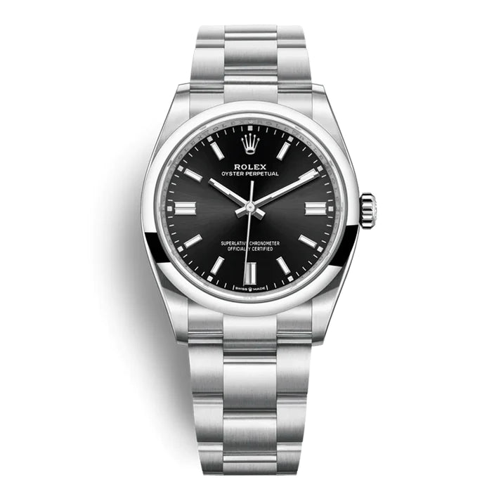 Stainless steel case with a stainless steel bracelet. Fixed stainless steel bezel. Black dial with luminous silver-tone hands and index hour markers. Minute markers around the outer rim. Dial Type: Analog. Luminescent hands and markers. Rolex calibre 3230 automatic movement, containing 31 Jewels, bitting at 28800 vph, and has a power reserve of approximately 70 hours. Scratch resistant sapphire crystal. Screw down crown. Solid case back. Round case shape. Case size: 36 mm. Oysterlock clasp. Water resistant at 100 meters / 330 feet. Functions: hour, minute, second.