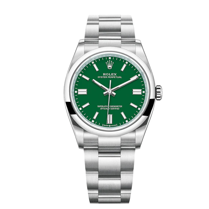 Stainless steel case with a stainless steel bracelet. Fixed stainless steel bezel. Green dial with luminous silver-tone hands and index hour markers. Minute markers around the outer rim. Dial Type: Analog. Luminescent hands and markers. Rolex calibre 3230 automatic movement, containing 31 Jewels, bitting at 28800 vph, and has a power reserve of approximately 70 hours. Scratch resistant sapphire crystal. Screw down crown. Solid case back. Round case shape. Case size: 36 mm. Oysterlock clasp. Water resistant at 100 meters / 330 feet. Functions: hour, minute, second.