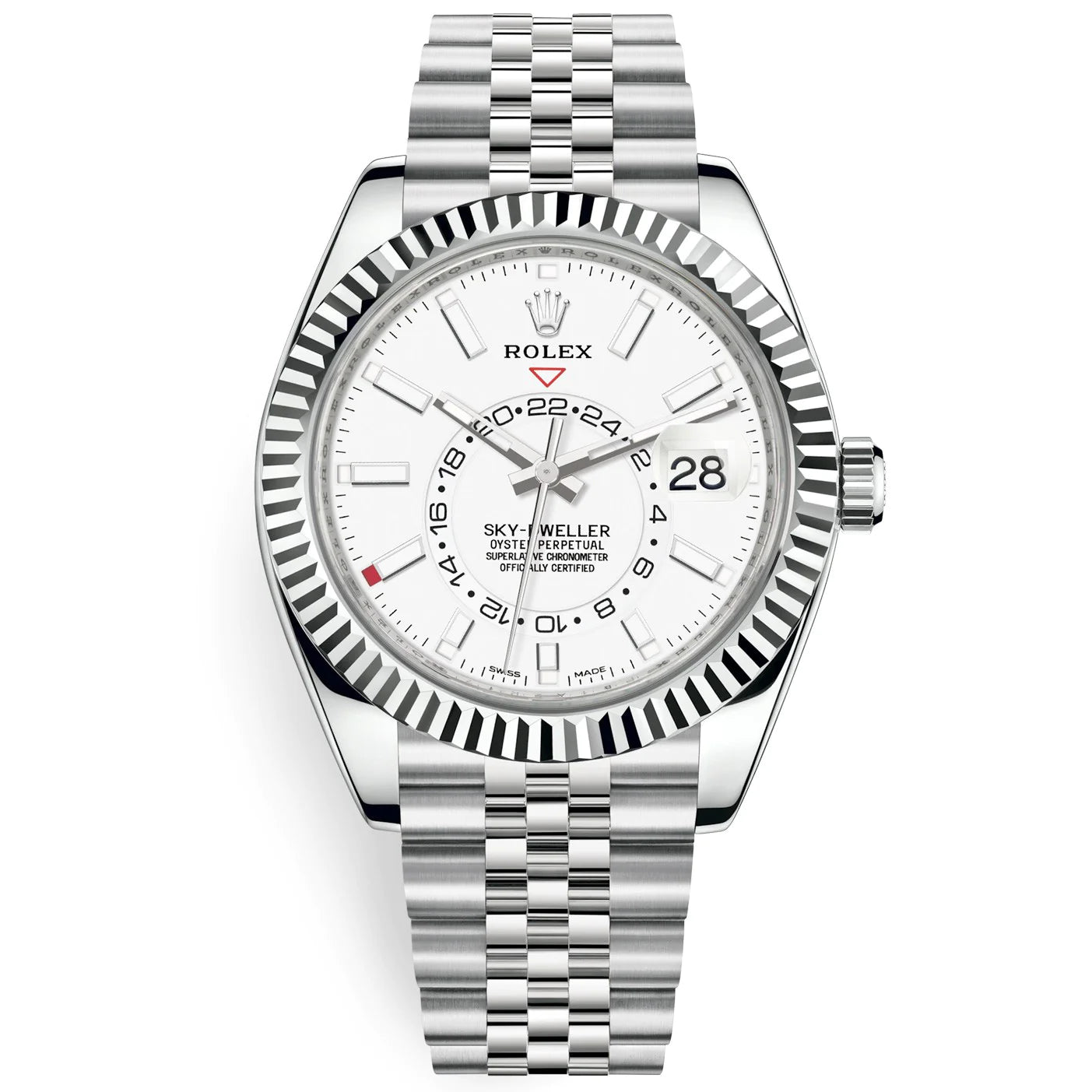 Silver-tone stainless steel case with a stainless steel Rolex jubilee bracelet with 18kt white gold center links. Fluted ring command 18kt white gold bezel. White dial with luminous silver-tone hands and index hour markers. Minute markers around the outer rim. Dial Type: Analog. Luminescent hands and markers. Date display at the 3 o'clock position. 24 hours sub-dial. Rolex calibre 9001 automatic movement, containing 40 Jewels, composed of 380 parts, bitting at 28800 vph, and has a power reserve of approximately 72 hours. Scratch resistant sapphire crystal. Screw down crown. Solid case back. Round case shape. Case size: 42 mm. Oysterlock clasp. Water resistant at 100 meters / 330 feet. Functions: annual calendar, month, date, GMT, second time zone, hour, minute, second, chronometer.