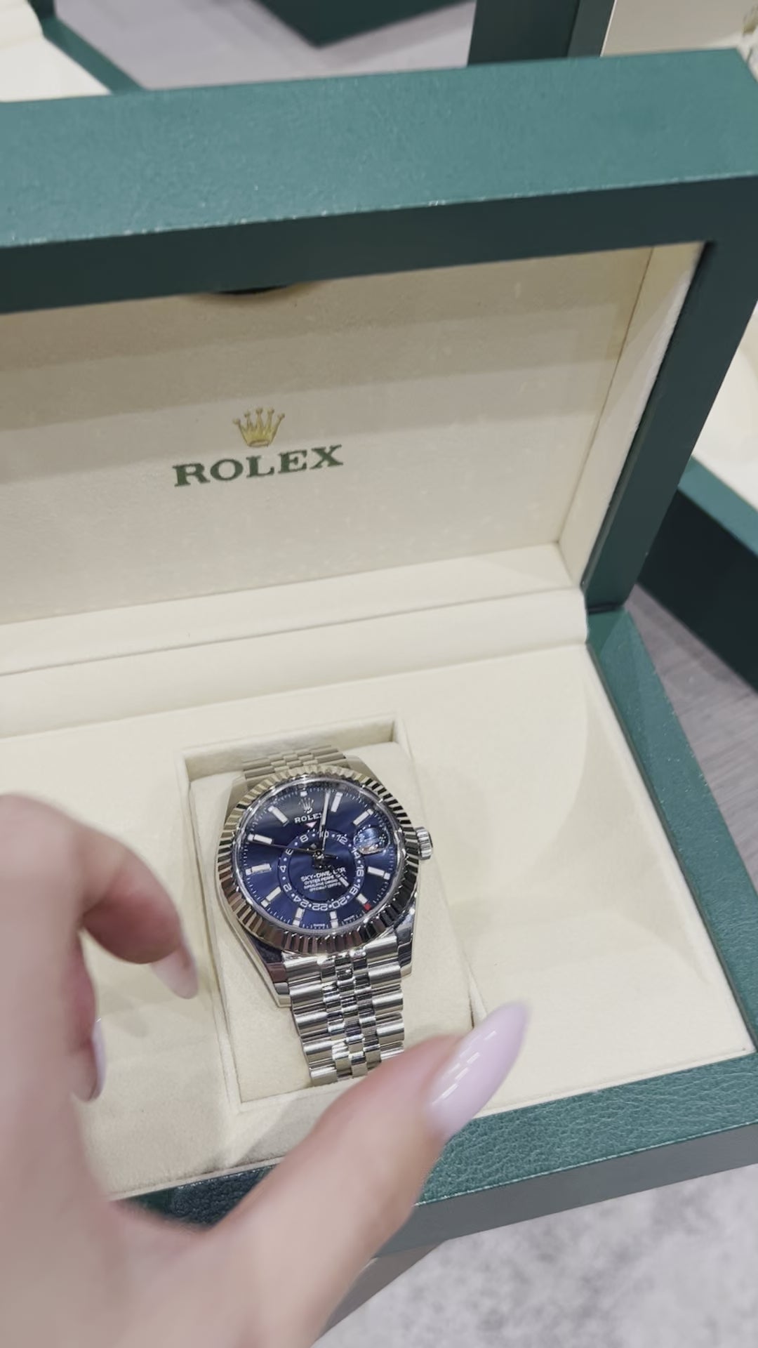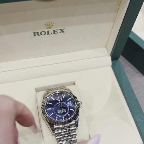 Silver-tone stainless steel case with a stainless steel Rolex jubilee bracelet with 18kt white gold center links. Fluted ring command 18kt white gold bezel. Blue dial with luminous silver-tone hands and index hour markers. Minute markers around the outer rim. Dial Type: Analog. Luminescent hands and markers. Date display at the 3 o'clock position. 24 hours sub-dial. Rolex calibre 9001 automatic movement, containing 40 Jewels, composed of 380 parts, bitting at 28800 vph, and has a power reserve of approximately 72 hours. Scratch resistant sapphire crystal. Screw down crown. Solid case back. Round case shape. Case size: 42 mm. Oysterlock clasp. Water resistant at 100 meters / 330 feet. Functions: annual calendar, month, date, GMT, second time zone, hour, minute, second, chronometer.
