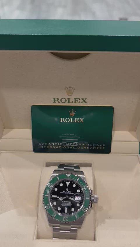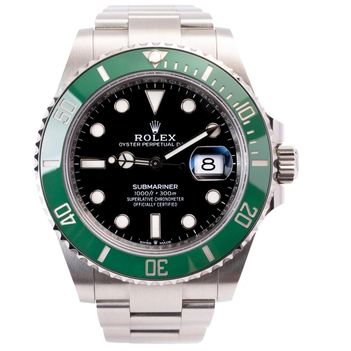 The Oyster Perpetual Submariner Date in Oystersteel with a Cerachrom bezel insert in green ceramic and a black dial with large luminescent hour markers.